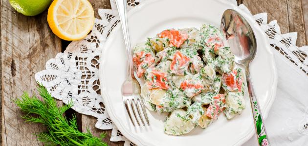 - ضع سلطة اللبن مع البطاطا في وعاء التقديم وأضف لها زيت الزيتون وزبّنها بالنعنع وقدّمها باردة لأحبّائك.